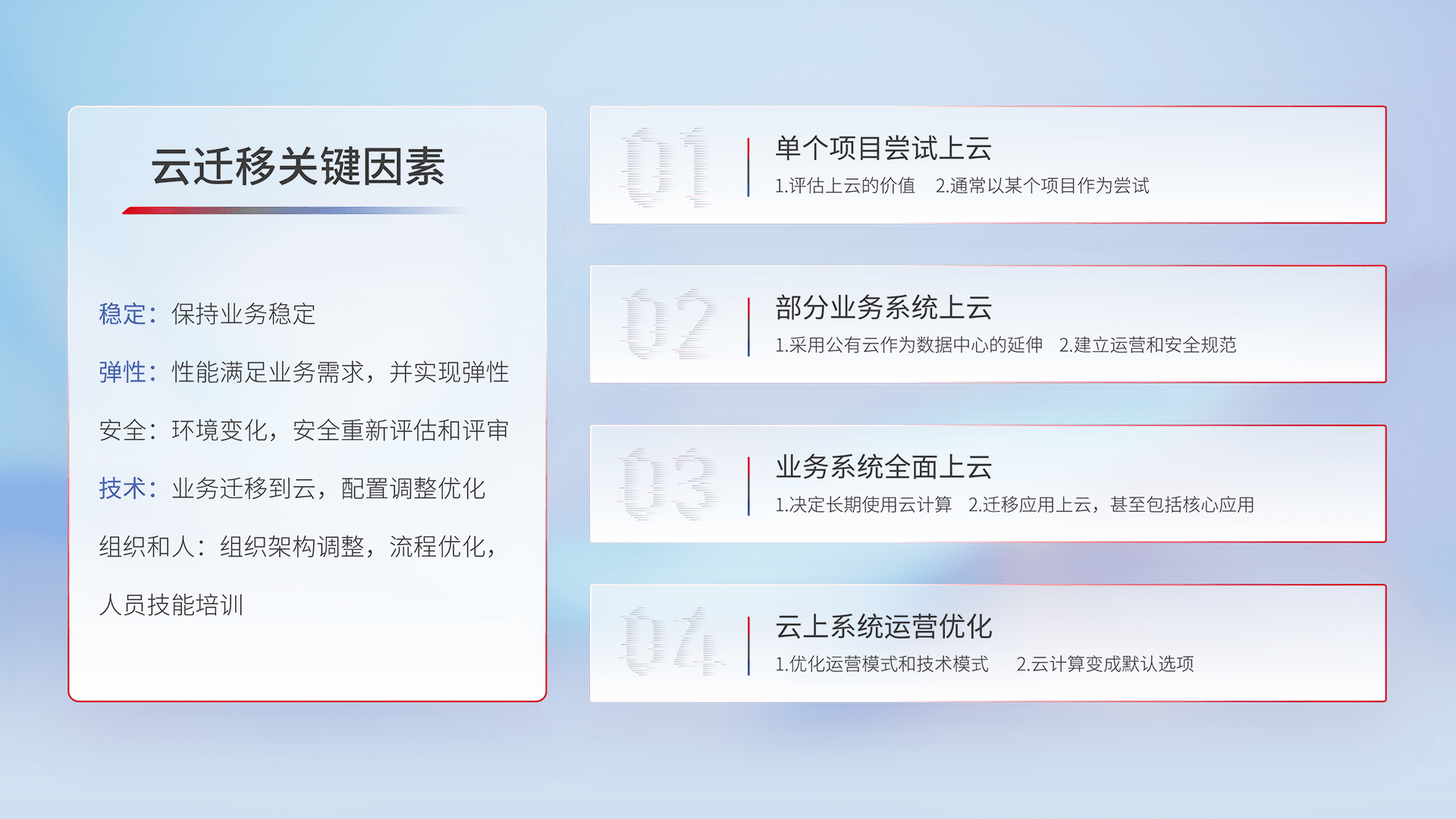 结合实际业务,,,从规划设计、、、云平台选型、、、、云原生改造、、数据迁移、、集成交付,,迁移全过程为客户识别最佳上云路径,,,,做好风险识别管理,,设计网络架构、、、、身份权限、、、、安全审计合规、、、、操作审计、、、、日志审计、、、、监控告警策略、、、、多站点容灾设计等,,对云上基础设施进行整体规划,,提升IT治理水平,,,,以满足弹性、、、、高可用、、、、高性能的需求。。。